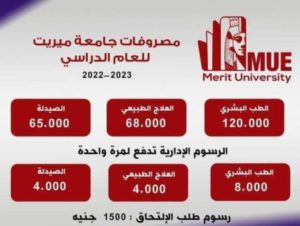 تبدأ المصروفات من 65 ألف جنية، أعلنت جامعة ميريت عن تفاصيل مصروفات الجامعة 2022 – 2023 لطلاب الثانوية العامة، وما يعادلها من شهادات، مشيرة إلي أن مصروفات الطلاب المصريين بالجنية المصري.