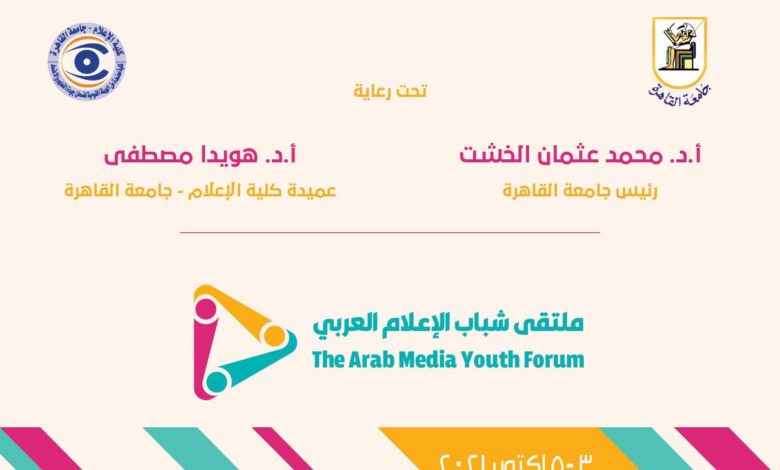 برعاية الدكتور محمد عثمان الخشت رئيس جامعة القاهرة والدكتورة هويدا مصطفى عميدة كلية الإعلام جامعة القاهرة تنظم الكلية ملتقى شباب الإعلام العربي في نسخته الأولى في الفترة من ٣ – ٥ أكتوبر ٢٠٢١ بالكلية ويضم الملتقى مجموعة من ورش العمل لخبراء وممارسين إعلاميين والتي تؤهل الطلاب لمواكبة التطور الحديث بسوق العمل الإعلامي كما يقام على هامش الملتقى مسابقة في أحد المجالات التالية “لأفلام الوثائقية – الصحافة المطبوعة والإلكترونية – الإعلانات”.