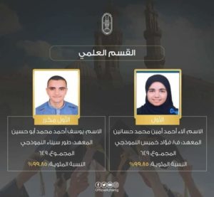 كما حصلت الطالبة آلاء أحمد أمين محمد حسنين، الطالبة بمعهد فتيات فؤاد خميس النموذجي بمنطقة الشرقية الأزهرية، والطالب يوسف أحمد محمد أبو حسين، الطالب بمعهد طور سيناء النموذجي بمنطقة جنوب سيناء، على المركزين الأول والأول مكرر على القسم العلمي بمجموع (٦٤٩) درجة بنسبة (٩٩.٨٥٪).