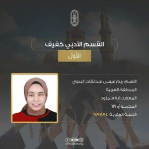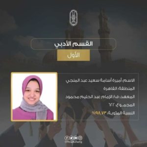 ▪︎ أميرة أسامة سعيد عبد المنجي المركز الأول على القسم الأدبي بمجموع (٦٢٢) درجة بنسبة (٩٨.٧٣٪)،