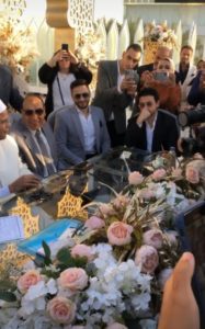 تداول رواد السوشيال الميديا مجموعة من الصور وفيديوهات وهو يمضي كشاهد على كتب كتاب معبراً عن فرحته للعروسين، وبعد كتب الكتاب غنى للعروسين في لقطة كوميدية من مقطع أغنية (والله وعملوها الرجالة).
