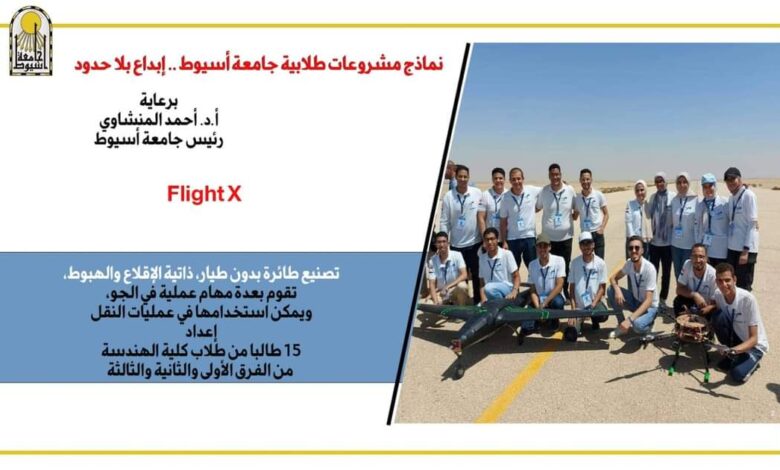 وأكد رئيس جامعةأسيوط، أن الجامعة لديها طلاب مبتكرين ونوابغ في الكثير من المجالات، وجاء طلاب كلية الهندسة بالمشروع الطلابي «Flight X» بجامعة أسيوط، بتصنيع طائرات بدون طيار، ذاتية الإقلاع والهبوط، تقوم بعدة مهام عملية في الجو، ويمكن استخدامها في عمليات النقل، وتم اعداد المشروع من خلال 15 طالب من طلاب كلية الهندسة من الفرقة الأولى والثانية والثالثة.