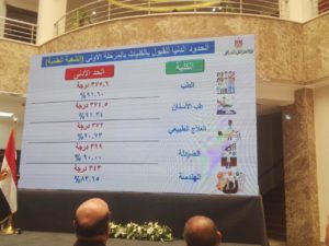 وأوضح وزير التعليم العالي في المؤتمر أن الحد الأدنى للقبول بكليات سياسة واقتصاد 340 درجة بنسبة 82.92%، فيما جاءت الألسن بـ329 درجة بنسبة 80.24%، والإعلام 316 درجة بنسبة 77.03% أما كلية الآثار كان الحد الأدنى 315 درجة بنسبة 76.82 % والفنون الجميلة 282 درجة بنسبة 68.87%.