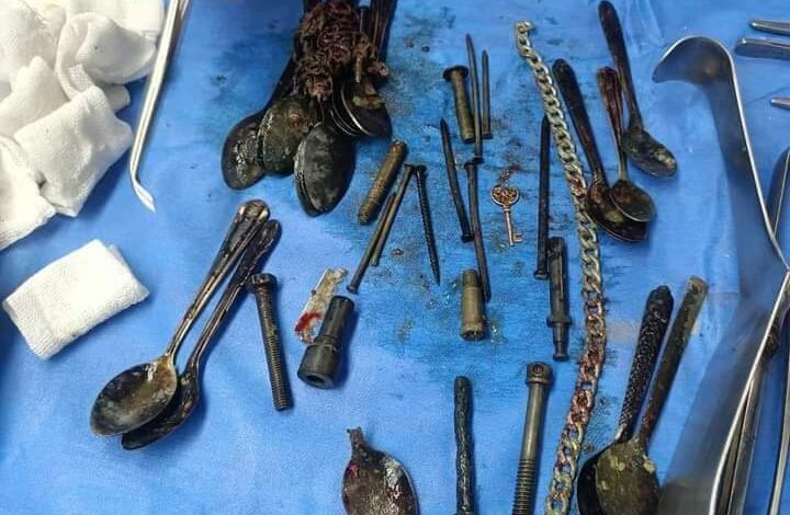 وأوضح الدكتور أحمد القاصد أن وحدة مناظير الجهاز الهضمى بقسم امراض الباطنه قد استقبلت مريضا يبلغ من العمر ٤٥ عاما يعانى من قئ مستمر وألام شديدة باعلى البطن ولا يستجيب للعلاج ، وعلي الفور تم عمل منظار للمريض على المعده أظهر وجود اجسام معدنية غريبه بالمعده عبارة عن ملاعق شاى صفيره وانسيال معدن وعدد من المسامير العادية ومسامير برمه وموس حلاقه و ٢ بوجيه سيارة ، تسببت فى التهابات مزمنة فى جدار المعدة والأم شديدة.
