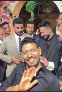 تداول رواد السوشيال الميديا مجموعة من الصور وفيديوهات وهو يمضي كشاهد على كتب كتاب معبراً عن فرحته للعروسين، وبعد كتب الكتاب غنى للعروسين في لقطة كوميدية من مقطع أغنية (والله وعملوها الرجالة).