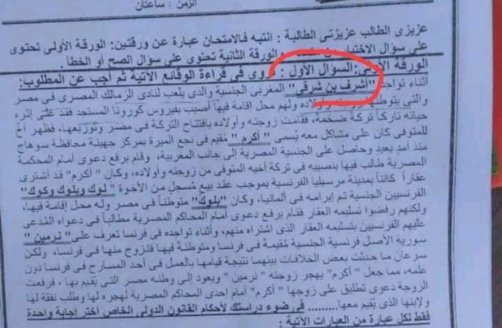 جاء ذلك عقب تداول رواد مواقع التواصل الاجتماعي، واقعة امتحان كلية الحقوق بجامعة سوهاج، لذكر سؤال للاعب اشرف بن شرقي لاعب نادي الزمالك، وما تناوله السؤال من المساس بحياة اللاعب الشخصية.