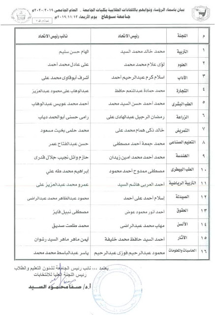أعلنت اللجنة العليا لانتخابات اتحاد الطلاب بجامعة سوهاج، عن النتائج النهائية لانتخاب رؤساء اتحاد الطلاب ونوابهم داخل ١٦ كلية، فمن بين ٢٢٤ طالب وطالبة الذين تم انتخابهم بالأمس كأمناء للجان الأنشطة ومساعديهم على مستوى كليات الجامعة، تم تصعيد ٣٢ طالب وطالبة اليوم للمنافسة غداً على منصب رئاسة اتحاد الطلاب ونائبه على مستوى الجامعة.